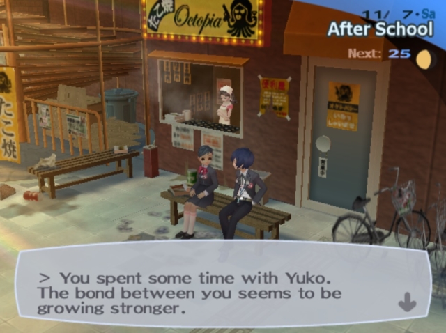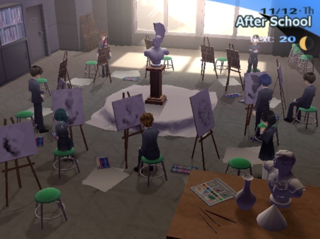 W niniejszej recenzji skupimy się na Personie 3, mojej ulubionej z całej serii. Gra ta została wydana w 2006 r. na platformę PlayStation 2. Rok później (a na Zachodzie w 2008 r.) wydano wersję rozszerzoną, Persona 3 FES, w której można też zagrać w epilog The Answer. W 2009 r. w Japonii (2010 w Ameryce, 2011 w Europie) Personę 3 wydano też na PlayStation Portable pod nazwą Persona 3 Portable – największą zaletą tej wersji była możliwość gry żeńską protagonistką, co pozwoliło lepiej poznać męską część drużyny głównych bohaterów. W Personie 3 po raz pierwszy oprócz elementów gry akcji wprowadzono też symulację życia społecznego w postaci Social Links – relacji nawiązywanych przez protagonistę z innymi bohaterami, bezpośrednio wpływających na rozwój Person. W tej grze znajdują się też silne nawiązania do tarota, gdyż każdy bohater reprezentuje kartę z grupy Wielkie Arkana (jest to grupa 22 z 78 kart typowej talii tarota, od Głupca do Świata, które mogą być interpretowane jako archetypy postaci i sytuacji, których doświadczamy w swojej życiowej wędrówce do oświecenia duszy). Podczas walki kierujemy tylko naszą postacią, pozostali członkowie drużyny działają autonomicznie, chociaż co turę można zmieniać ich taktykę wydając komendy takie jak Pełen Atak czy Leczenie/Support. Myślę, że jest to też najbardziej przygnębiająca i najcięższa tematycznie gra w serii. Nie mogę zbyt dużo zdradzić dlaczego tak sądzę, gdyż nie chcę pisać spoilerów, ale wielu bohaterów tej gry zmaga się z utratą bliskich osób i nawet wśród Social Links mało która historia jest szczęśliwa. Podziwiam twórców, że zdecydowali się napisać fabułę poruszającą taką tematykę i między innymi dlatego tak bardzo lubię tę grę. Persona 3 doczekała się 4 pełnometrażowych filmów anime oraz 5 musicali Persona 3: The Weird Masquerade. Jako że w Personie 3 Portable można też grać dziewczyną, każdy musical wystawiono w 2 wersjach – z męskim i żeńskim głównym bohaterem. Pierwszy z musicali, który nosi podtytuł Ao no Kakusei, znalazłam 2,5 roku temu przygotowując moją prelekcję o seiyuu, a półtora miesiąca temu wreszcie czułam się na tyle pewnie ze swoją znajomością języka japońskiego, że zaczęłam tłumaczyć całość na język angielski. Recenzja tego musicalu znajdzie się w drugiej części niniejszego artykułu, a poniżej przedstawiam galerię wykonanych przeze mnie zdjęć z gry, które zilustrują jak ona wygląda.